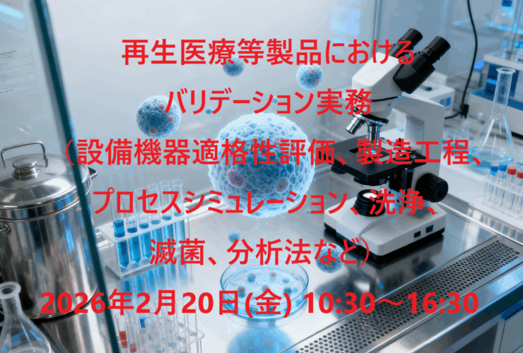 再生医療等製品は細胞やウイルスを扱うため製造管理が難しく、独自の考え方が必要です。本セミナーでは、ガイドラインと具体事例を基に、各種(設備機器の適格性評価、製造工程、プロセスシミュレーション、洗浄、滅菌、分析法など)バリデーションの評価方法を解説し、実務担当者がより高度で適切なバリデーションを行うための必須知識を提供します。