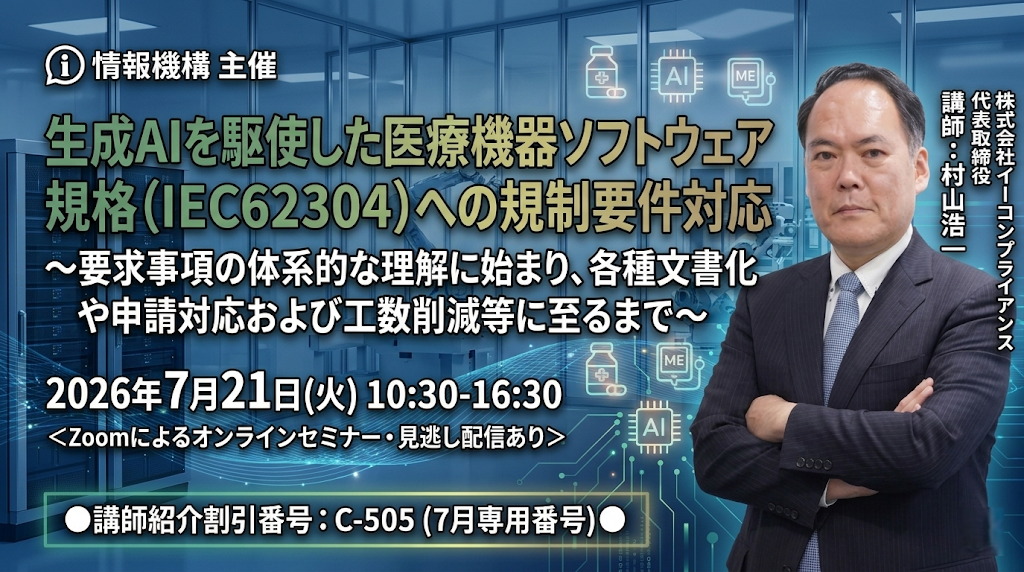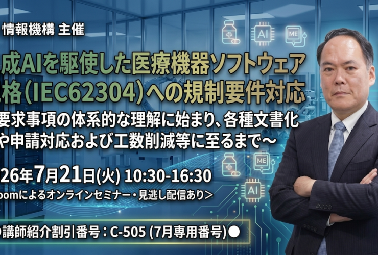 昨年実施時に大好評だった’IEC 62304(医療機器ソフトウェア)’解説セミナーを、満を持して ‘生成AI活用を軸にしたアップデート版’ として再開講! ソフトウェアライフサイクルの文書化、SOUP管理、サイバーセキュリティ統合、各国申請対応まで ― 情報量・内容・アフターフォローも充実のラインナップでお届けします。