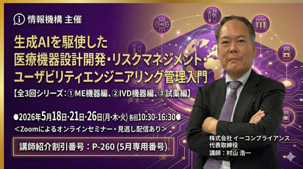 | セミナータイトル | 生成AIを駆使した医療機器設計開発・リスクマネジメント・ユーザビリティエンジニアリング管理入門 【全3回シリーズ:①ME機器編、②IVD機器編、③試薬編】 |