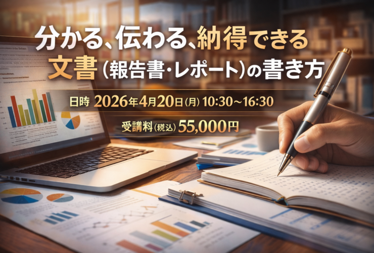 伝えたいことが伝わり、分かりやすくて読みやすい文書の書き方を詳細に解説するセミナーです。報告書・レポートの構成とストーリー構築、伝わる文章表現のテクニック、日本語の基本と文書作成の注意点を体系的に学びます。